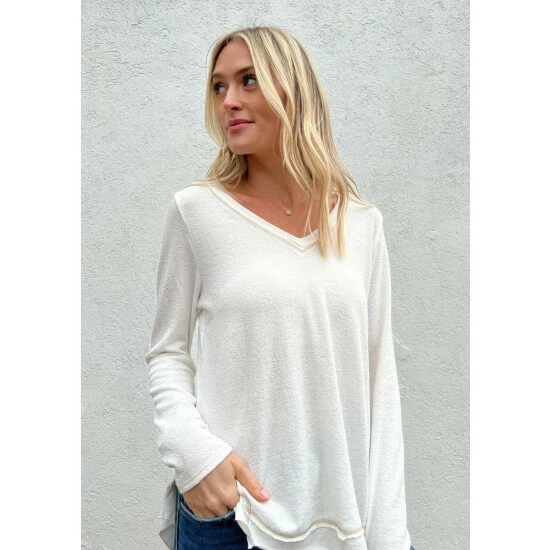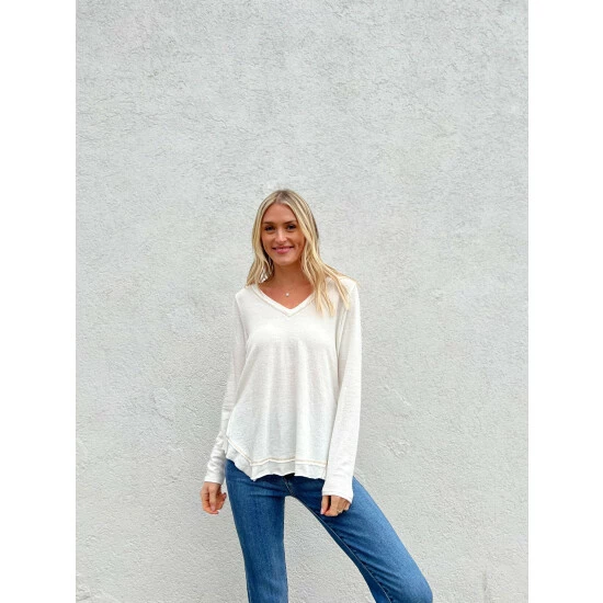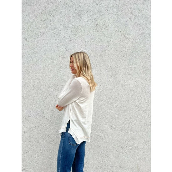 Our favorite crepe hacci fabric in a brand new style! Featuring a v-neck neckline, with contrast stitching and a side slit hem.