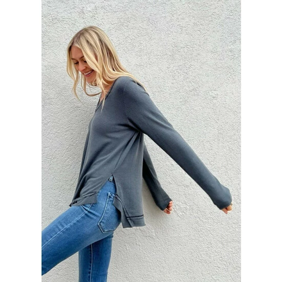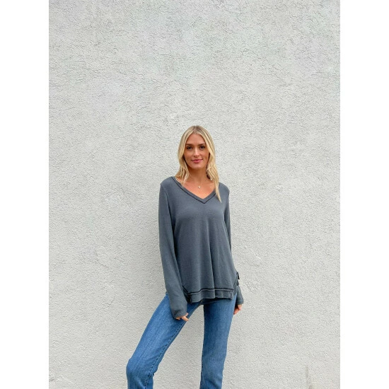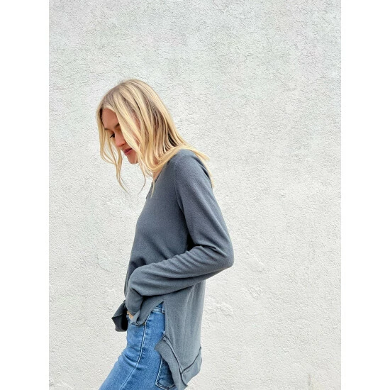 Our favorite crepe hacci fabric in a brand new style! Featuring a v-neck neckline, with contrast stitching and a side slit hem.