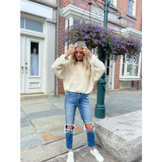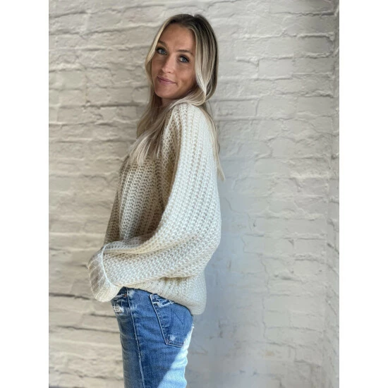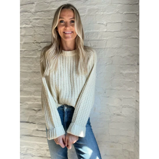 This chunky knit sweater features folded over cuffs – and a split back detail. Coming in three colors – it’s hard to pick just one!