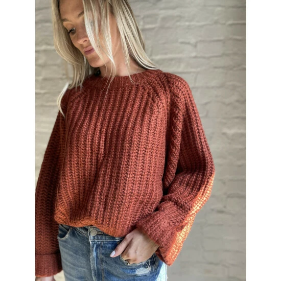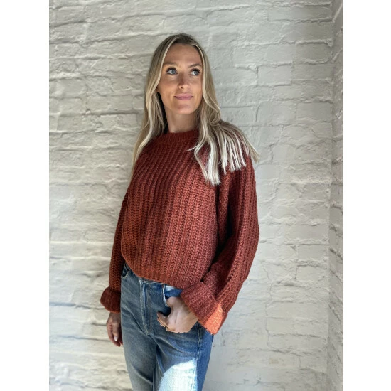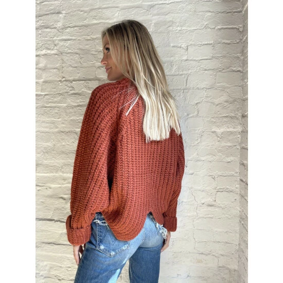 This chunky knit sweater features folded over cuffs – and a split back detail. Coming in three colors – it’s hard to pick just one!