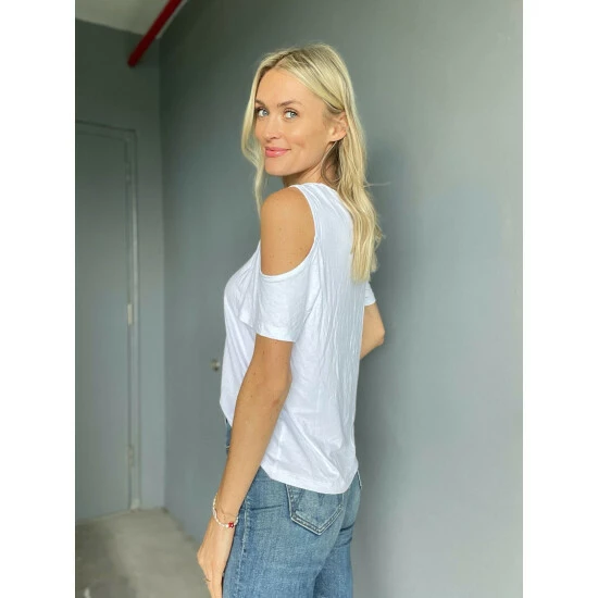 Featuring a double cut out shoulder, with tie detail, wear this now with denim or later with white cutoffs.