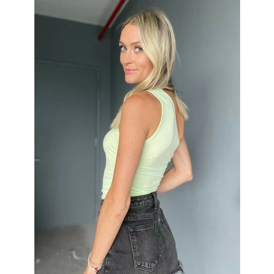 One shoulder and fitted, this tank gives a bodysuit look. We had to do it in fun colors for summer!